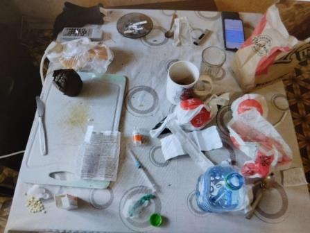 При осмотре жилого помещения полицейские обнаружили предметы, свидетельствующие о регулярном употреблении там наркотиков: использованные шприцы, стеклянный флакон со следами вещества, стеклянная курительная трубка со следами нагара, остатки порошкового вещества. Все изъятое направлено на экспертизу.